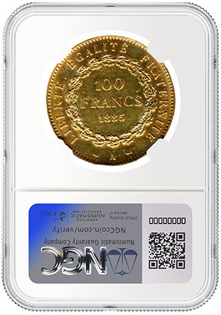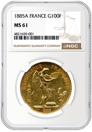 The top NGC-certified coin in the auction is a France 1885A Gold 100 Francs graded NGC MS 61 (lot 592), with an estimate of at least SGD9,000 (about $7,000). One of only 41 examples in the NGC Census, it was issued during the rule of Jules Grévy, the fourth president of France and the first one who was not a monarchist.
