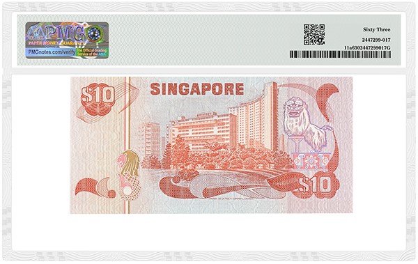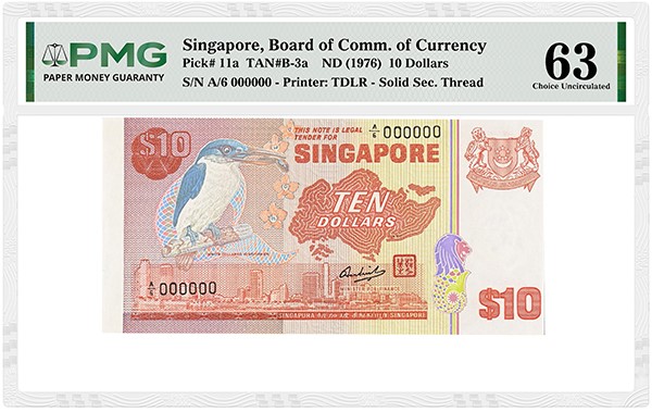 Meanwhile, the top PMG-certified note in the auction is a Singapore, Board of Commissioners of Currency ND (1976) 10 Dollars graded PMG 63 Choice Uncirculated (lot 142), with an estimate of at least SGD8,500 (about $6,600). This note is from Singapore's famous Bird Series of banknotes and depicts a White-collared Kingfisher.