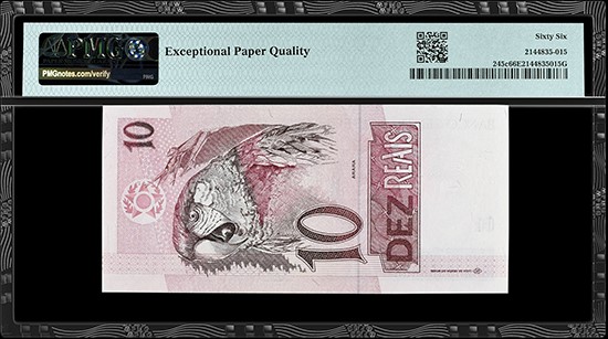 Green winged macaws are native to warm and tropical climates, such as South America. A magnificent example of the macaw is featured on the back of this Brazil, Banco Central ND (1994) 10 Reais.