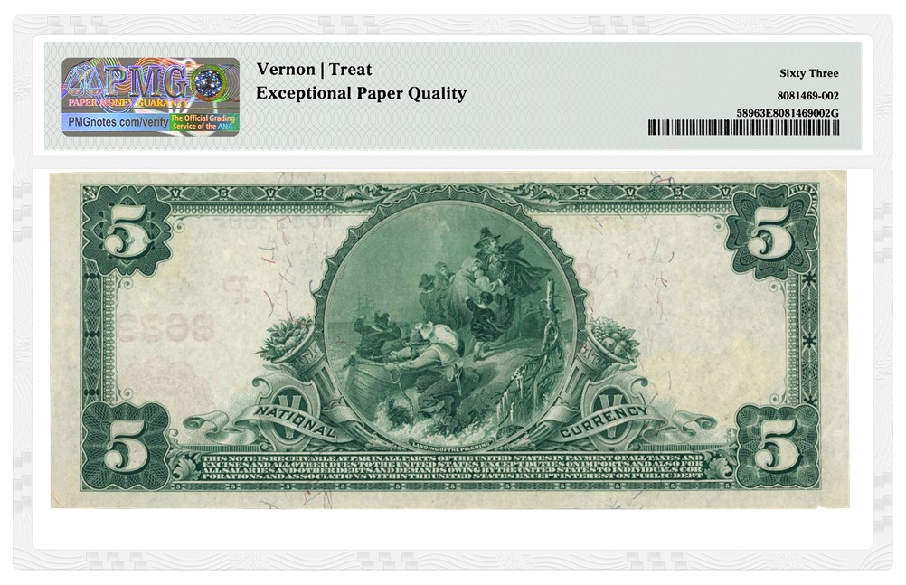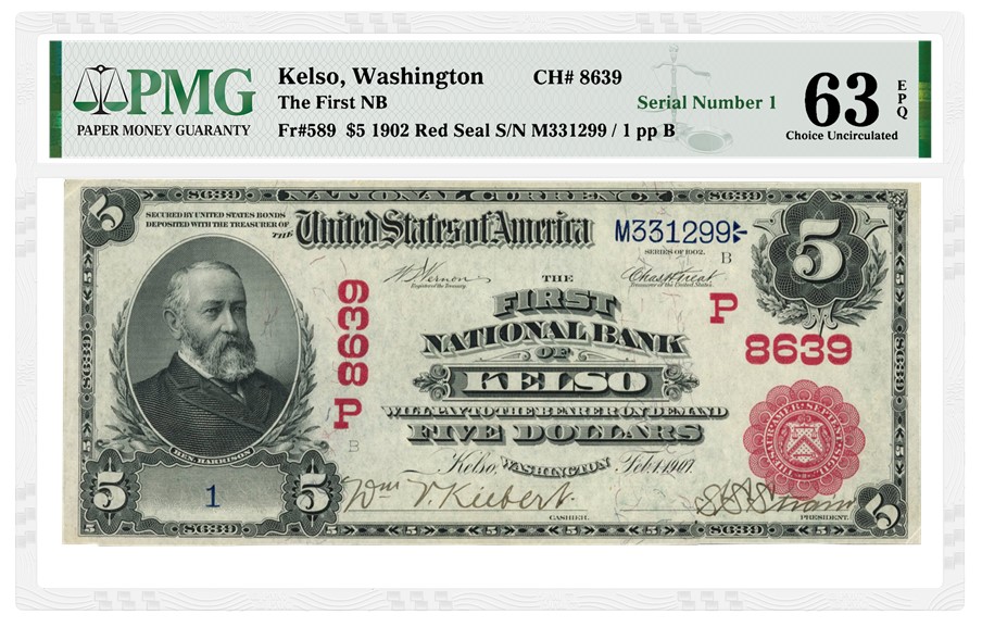 Among the offerings is a Kelso, Washington 1902 $5 Red Seal with Serial Number 1 graded PMG 63 Choice Uncirculated EPQ (lot 1641569). Bidding had already surpassed $7,000 more than a week before bidding closes on this lot on October 27, 2024. Printed for individual US banks, the Red Seal notes were issued early in the 1902 Series of National Bank Notes. National Bank Notes with Serial Number 1 are especially prized by the collecting community, and they sometimes represent the first notes issued by their bank.