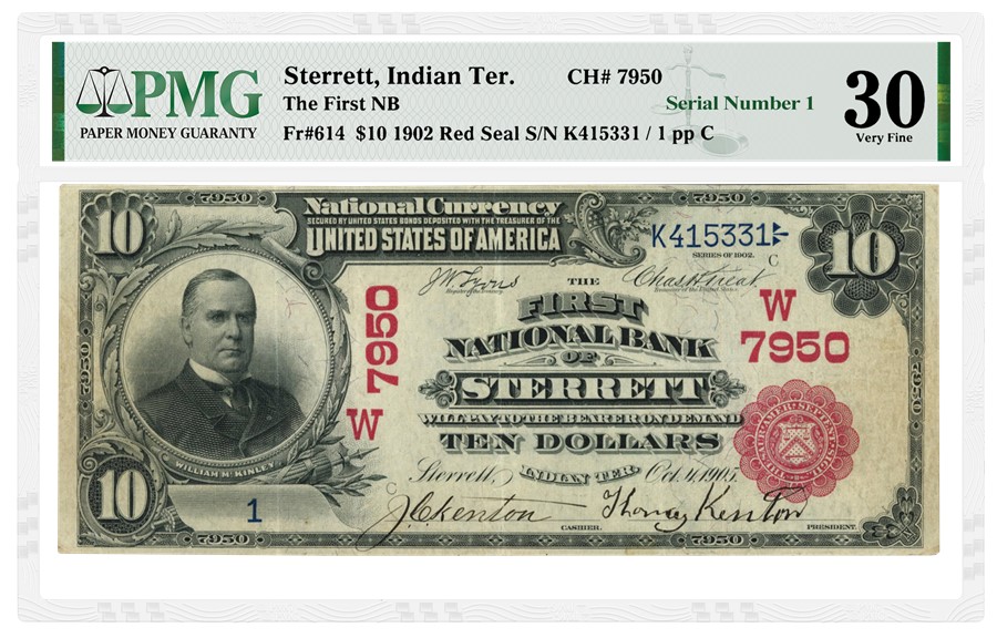 - a Columbia, Kentucky 1902 $10 Red Seal with Serial Number 1 graded PMG 25 Very Fine (lot 1641483), for which bidding ends on March 9