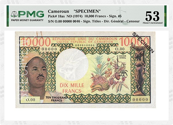 A top PMG-graded highlight in the auction is a Cameroun ND (1974) 10,000 Francs Specimen graded PMG 53 About Uncirculated (lot 42), with an estimate of €1,000 to €1,500 (about $1,200 to $1,750). The obverse of this high-denomination rarity features a depiction of President Ahmadou Ahidjo, who was the first president of Cameroon from 1960 to 1982 and who helped the country establish itself as an independent state. This particular note is not only the "Top Pop" but is also the only example of this catalog number in the PMG Population Report.