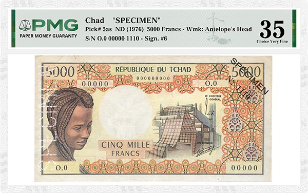 - a Chad ND (1974) 500 Francs Specimen graded PMG 53 About Uncirculated (lot 64), with an estimate of €350 to €500 (about $400 to $600)