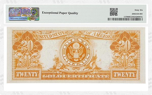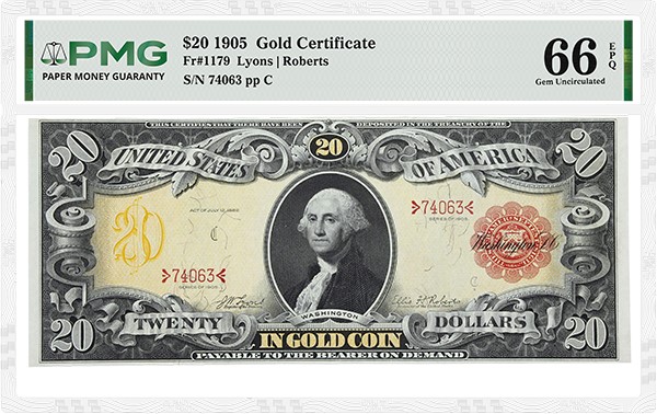- a 1905 $20 Gold Certificate graded PMG 64 Choice Uncirculated EPQ★ (lot 7140), which has an estimate of $30,000 to $50,000