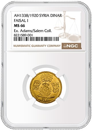 In addition to more than 400 PMG-certified banknotes, the auction also includes a single coin certified by Numismatic Guaranty Company® (NGC®) that is one of the greatest rarities of Mideast numismatics. The Syria AH1338/1920 Dinar (lot 115A) is graded NGC MS 66, the single-highest graded example, according to the auction house. Only a handful of these were struck for Faisal I, who ruled the Arab Kingdom of Syria for a few months in 1920 before being exiled by the French. Subsequently, he was King of Iraq from 1921 to 1933. This seldom-seen coin has an estimate of £200,000 to £300,000 (about $270,000 to $410,000).