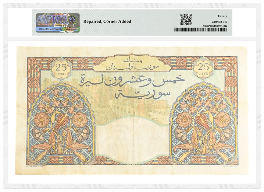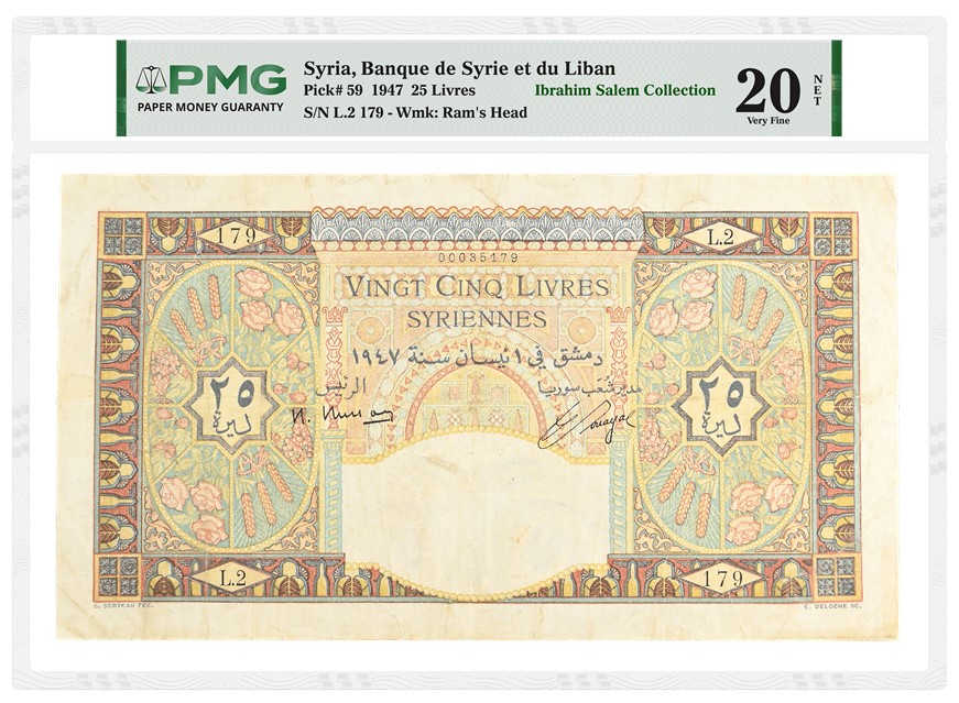 - a Syria, Banque de Syrie et du Liban 1942 100 Livres graded PMG 20 Very Fine (lot 311), with an estimate of £6,000 to £8,000 (about $8,100 to $10,000)