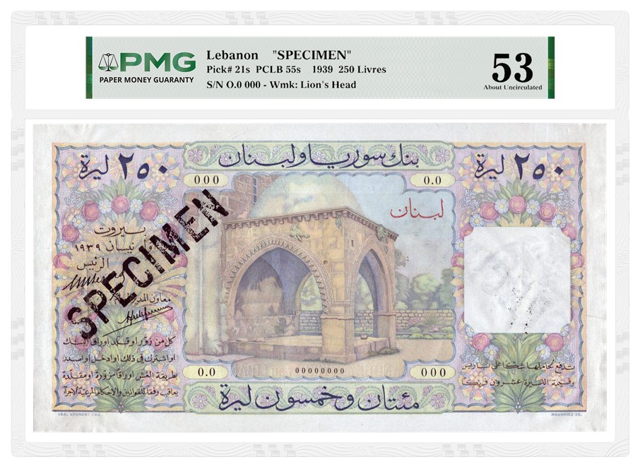 Among the top banknotes in the auction is a Lebanon 1939 250 Livres Specimen graded PMG 53 About Uncirculated (lot 19), which has an estimate of £15,000 to £20,000 (about $20,000 to $27,000). From the French Mandate era, this high-denomination Specimen was printed in limited numbers for reference at a time when Lebanon was still years away from full independence. Only four Specimens of this catalog number are listed in the PMG Population Report, with only one in a higher grade than this example.