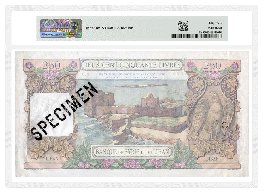 - a Lebanon 1945 100 Livres Specimen graded PMG 63 Choice Uncirculated EPQ (lot 64), with an estimate of £8,000 to £10,000 (about $10,000 to $13,000)