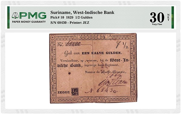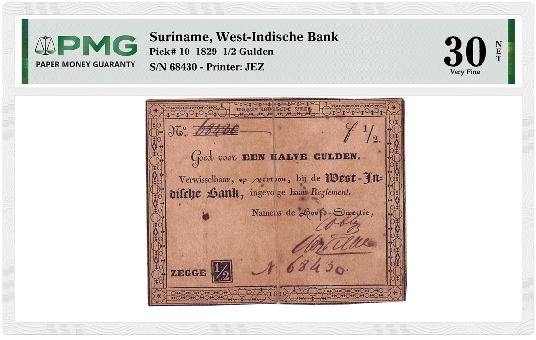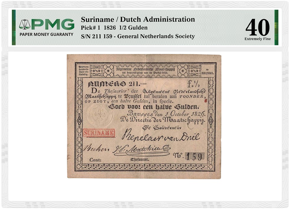 Among the auction highlights are two incredibly rare Half Gulden notes: a Suriname / Dutch Administration 1826 Half Gulden graded PMG 40 Extremely Fine (lot 4) and a Suriname / Dutch Administration 1829 Half Gulden graded PMG 30 Very Fine NET (lot 5). The 1829 is the only example in the PMG Population Report, where only seven examples across all catalog numbers are recorded for the Half Gulden denomination.