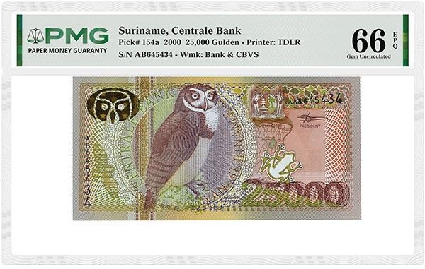 The set is powered by a complete set of the bird series from 2000 (Pick# 146 to 154), all with images, meaning you can enjoy them as part of the set's slideshow here. These are led by a Suriname, Centrale Bank 2000 25,000 Gulden graded PMG 66 Gem Uncirculated EPQ. The birds on the notes include (from the lowest denomination to the highest): red-necked woodpecker; black-throated mango; white-throated toucan; long-tailed hermit; Guianan cock-of-the-rock; royal flycatcher; sun parakeet; ornate hawk-eagle; and spectacled owl. (For fans of these bird notes, the PMG Registry has a category just for them here.)