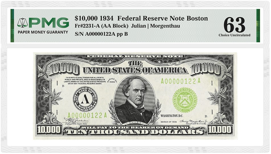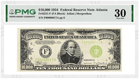 The top lot in the auction is a 1934 $10,000 Federal Reserve Note (Boston) graded PMG 63 Choice Uncirculated (lot 22268), which has an estimate of at least $300,000. This newly reported example of the catalog number associated with Boston brings the total surviving examples to 18, according to the auction house. Meanwhile, a 1934 $10,000 Federal Reserve Note (Atlanta) graded PMG 30 Very Fine (lot 22269) that has an estimate of at least $150,000 is one of only two known survivors of these Atlanta notes.