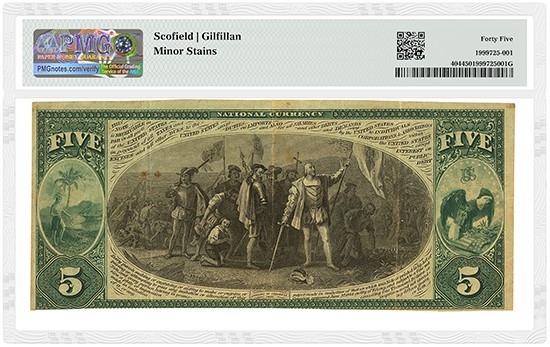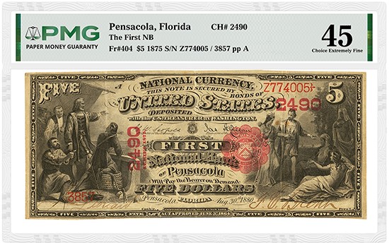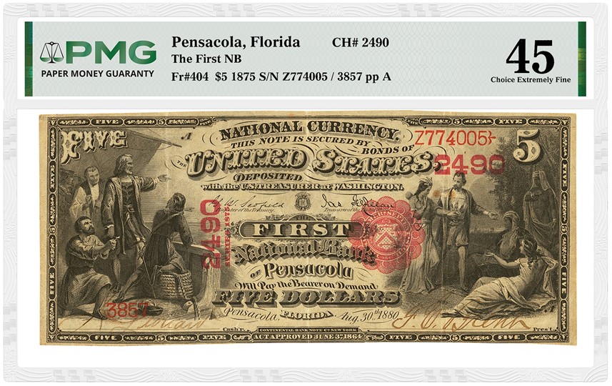 A Pensacola, Florida 1875 $5 National Bank Note graded PMG 45 Choice Extremely Fine (lot 20372) is also making waves ahead of the sale, with an estimate of at least $150,000. Out of the 12,000 banks that issued currency under the National Bank Act in the late 19th century, Florida Charter notes are exceedingly rare, as only around 5,000 notes have been reported within current currency circles. This Pensacola note is only the fourth First Charter note from Florida known, and it is in remarkable condition.