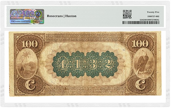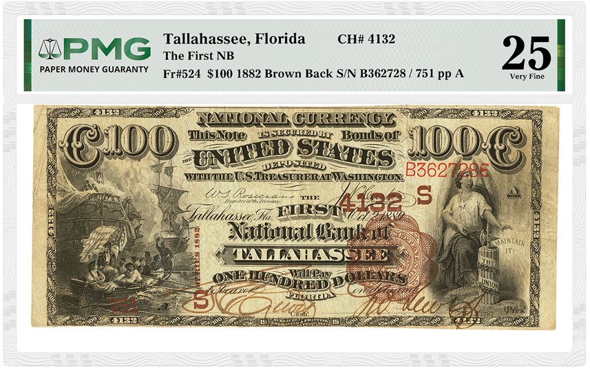 Additionally, a Tallahassee, Florida 1882 $100 Brown Back National Bank Note graded PMG 25 Very Fine (lot 20381) also has an estimate of at least $150,000. Brown Back notes were issued by individual National Banks under the National Bank Act throughout the late 19th century. While all Brown Back notes are collectible, $100 notes — the series’ highest denomination — are particularly valuable to collectors. Although seven Florida banks issued $100 Brown Backs to the tune of 6,400 notes, only three are reported, with all three from the Tallahassee bank, according to the auction house.