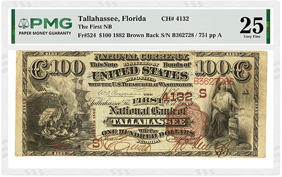 - a Jacksonville, Florida 1882 $50 Brown Back National Bank Note graded PMG 30 Very Fine (lot 20358), with an estimate of at least $60,000