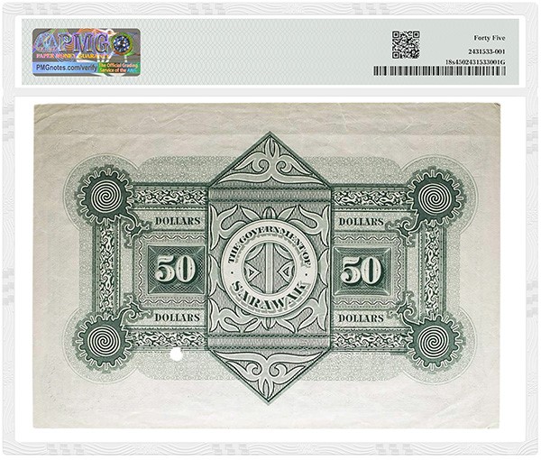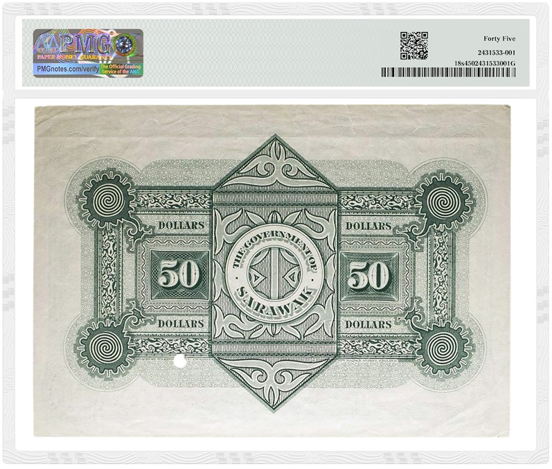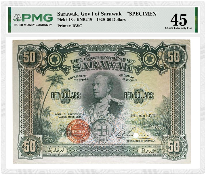The top PMG-certified highlight is a Sarawak, Government of Sarawak 1929 50 Dollars Specimen graded PMG 45 Choice Extremely Fine (lot 1118) with a starting price of €30,000 (about $35,000). The front of the note shows Charles Vyner Brooke, the last of the three White Rajahs who ruled Sarawak for about a century starting in 1841. Only a few high-denomination notes survive from Sarawak, which today is part of Malaysia. The PMG Population Report shows only a dozen of the 100 Dollar denomination and only 14 of the 50 Dollar denomination, including Specimens and Proofs.