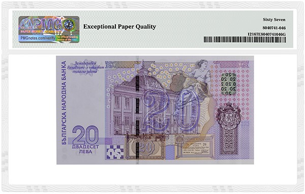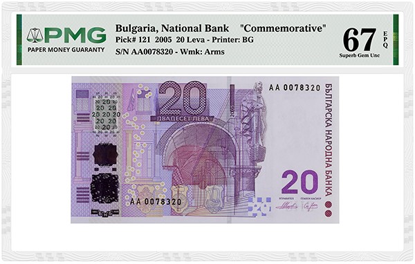 The final banknote listed in the set is a Bulgaria, National Bank 2005 20 Leva Commemorative, which celebrates the 120th anniversary of the first Bulgarian banknote, an 1885 20 Leva Zlato (extremely difficult to find these days and outside the range of this PMG Registry set). An image of this note is shown on the back of the commemorative, along with a sculpture of a seated woman that is used on the 1920 2 Leva Srebro shown earlier in this column.