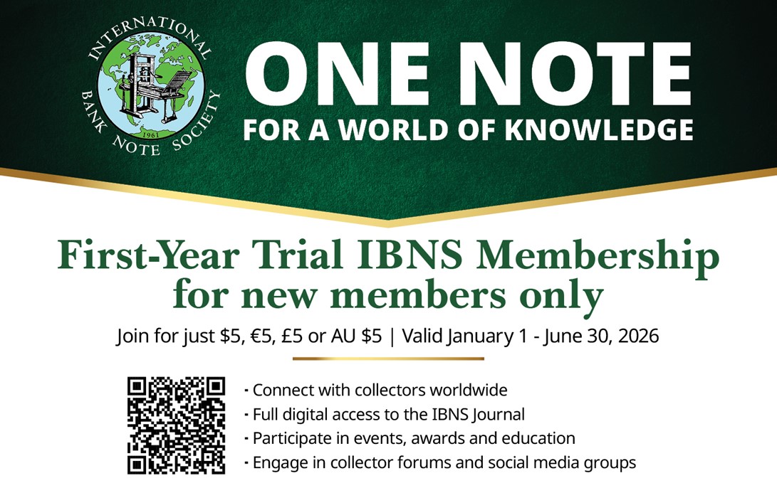 The International Bank Note Society (IBNS) is currently offering first-year trial memberships at a special rate through its "One Note For A World Of Knowledge" membership deal. Collectors and dealers can take advantage of the special IBNS membership offer for a limited time (January 1 through June 30, 2026) for only $5!