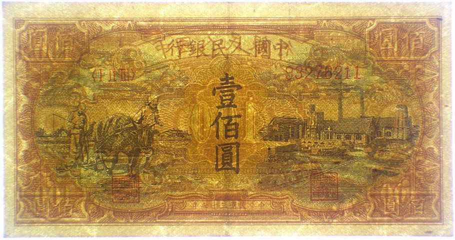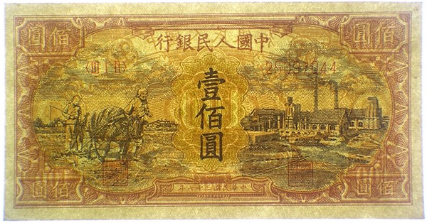 Pick# 808a/b – 1949 People's Bank of China 100 Yuan Plowing and Factory - Without Watermark/Stars Watermark