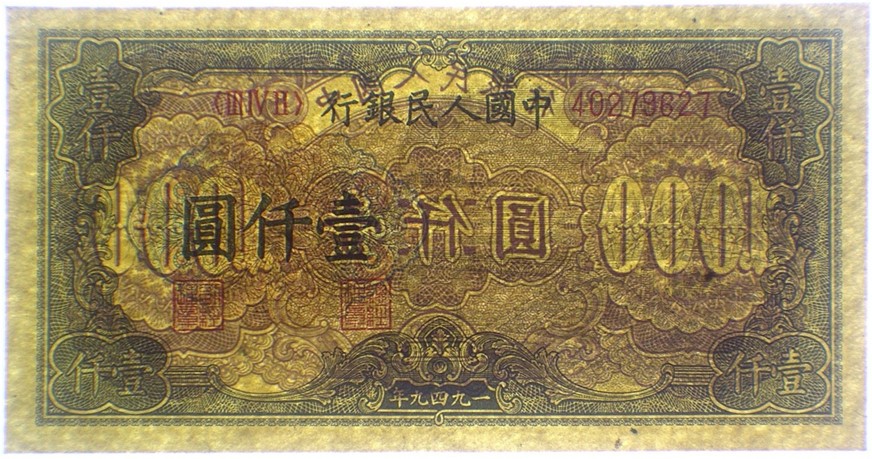 Pick# 847a/c – 1949 People's Bank of China 1,000 Yuan Qiantang River Bridge, Without Watermark/Stars Watermark