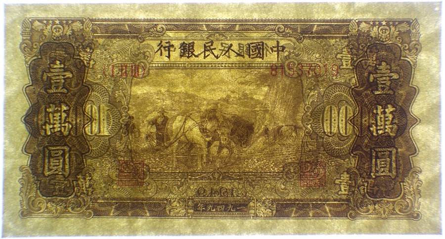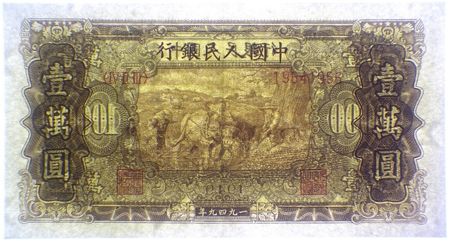 Pick# 853b/c – 1949 People's Bank of China 10,000 Yuan Note with Double Horse Plowing and Open Star Watermark/Triangles Watermark