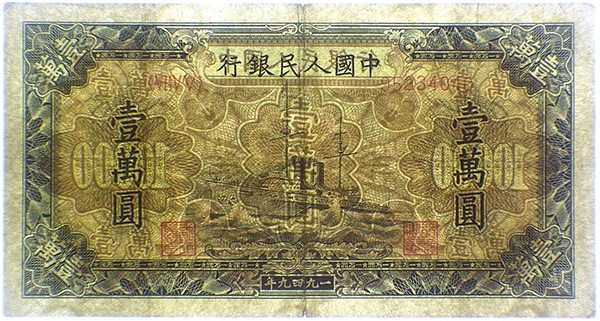 Pick# 854b/c – 1949 People's Bank of China 10,000 Yuan Warship Open Star/Triangles Watermark