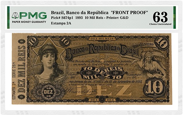 The auction's highlights include a Brazil, Banco da Republica 1893 10 Mil Reis graded PMG 63 Choice Uncirculated and Netherlands, Nederlandsche Bank 1914 10 Gulden Proof graded PMG 53 About Uncirculated EPQ and pedigreed to the Toele Collection. A Proof represents a stage in a banknote's design process prior to its approval for production for circulation. This is the only example of this particular Brazil Proof in the PMG Population Report, and one of only two Proofs of this particular Netherlands note that are listed there.