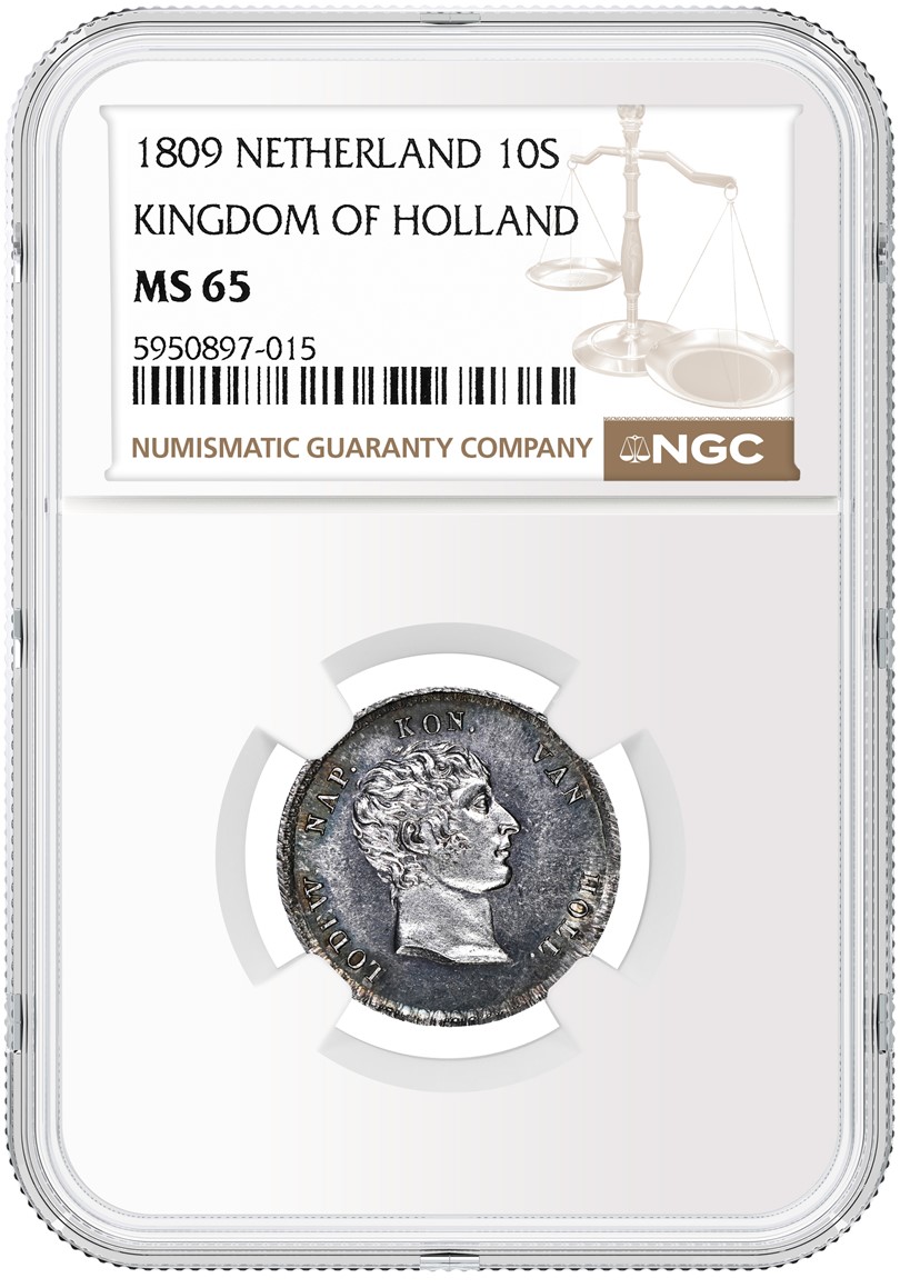 The auction also includes dozens of coins certified by Numismatic Guaranty Company® (NGC®), including a Netherlands 1809 Kingdom of Holland 10 Stuivers graded NGC MS 65 (lot 1841). It depicts Louis Bonaparte, the King of Holland and younger brother of the French emperor, who eventually forced him into exile. This coin is unsurpassed in the NGC Census out of a dozen there.