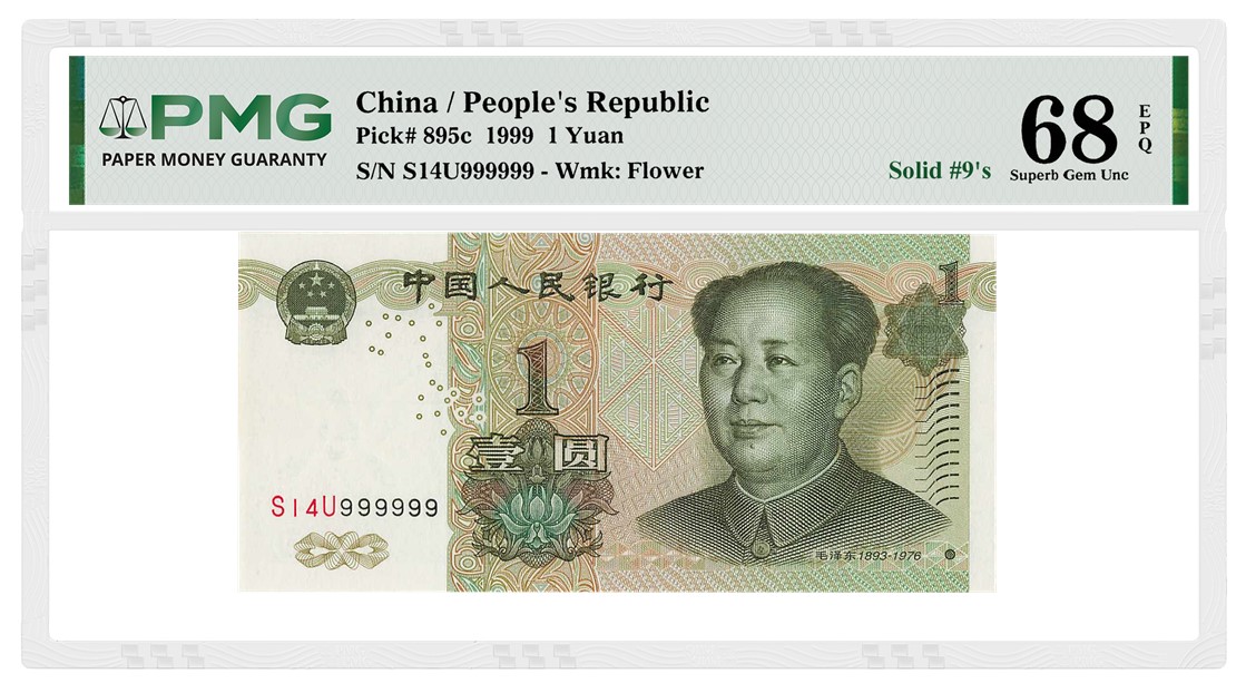 Among the top highlights of the notes with fancy serial numbers are more than two dozen Solid Serial Numbers. These include a Philippines 2010-16H Bangko Sentral 50 Piso with a Solid-1 Serial Number graded PMG 65 Gem Uncirculated EPQ (lot 1234) and a China / People’s Republic 1999 1 Yuan with a Solid-9 Serial Number graded PMG 68 Superb Gem Uncirculated EPQ (lot 213).