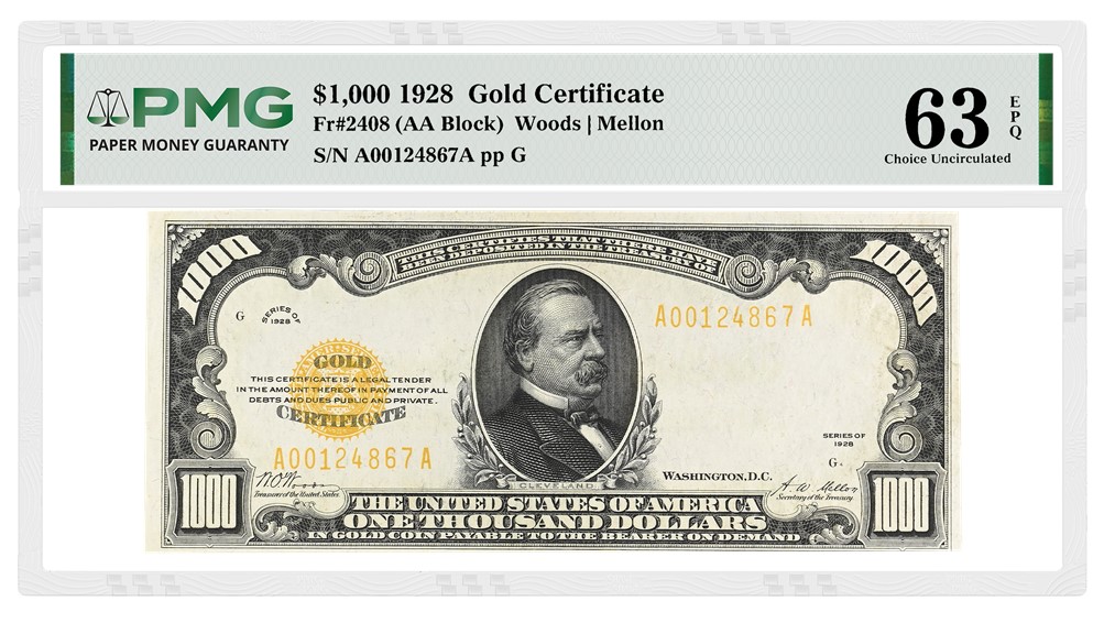 Adding to the excitement are more Gold Certificates from the 1928 series: a $500 Gold Certificate graded PMG 65 Gem Uncirculated EPQ (lot 7058), with an estimate of $150,000 to $250,000, and a $1,000 Gold Certificate graded PMG 63 Choice Uncirculated EPQ (lot 7059), with an estimate of $100,000 to $150,000. Within the same Series of 1928, the $500 and $1,000 Gold Certificates represent the highest denominations of gold-backed paper money ever intended for public circulation.