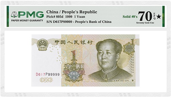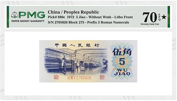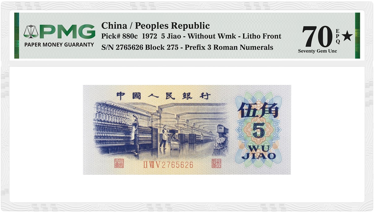 But this challenging set includes much more, including the notes issued for circulation dated 1953 and later. Among them are a China 1972 5 Jiao and a China 1999 1 Yuan, each graded PMG 70★ Gem Uncirculated EPQ. A Solid-9 Serial Number adds to the collector interest of the latter note.