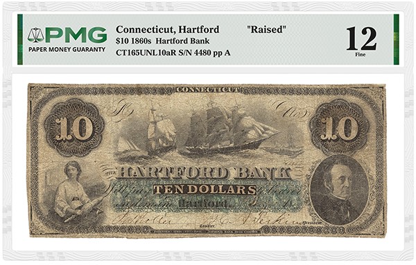 Under close examination, there are several clues this is a Raised note. Part of the black ink added to change each denomination to 10 covers the small words HARTFORD. Additionally, the word ONE can be seen repeated in the circles that form much of the border, as well as in the dark-green ink beneath the words HARTFORD BANK at the center of the note, pointing to the original denomination.