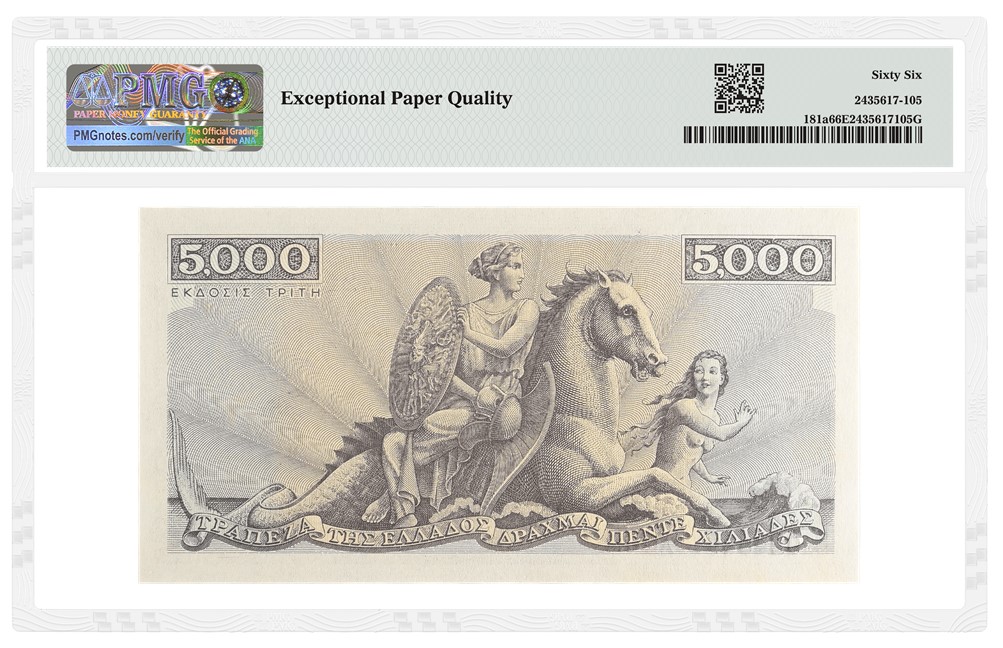 Among the top highlights is a Greece, Bank of Greece 1947 5,000 Drachmai graded PMG 66 Gem Uncirculated EPQ (lot 677). Issued in the shadow of postwar instability that led to the Greek Civil War, the 1947 Bank of Greece 5,000 Drachmai note, like many high-denomination issues of the era, saw its purchasing power was eroded quickly. This note is one of only two sharing the honor of having the top grade in the PMG Population Report, which includes more than 100 examples.