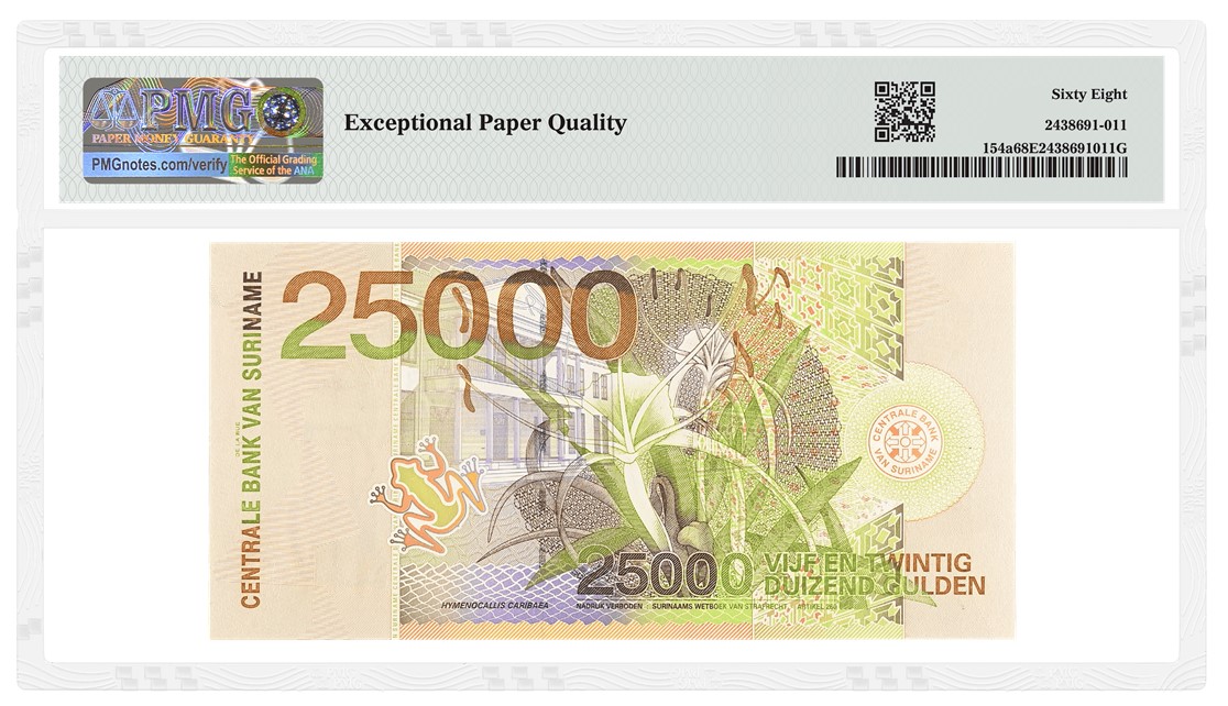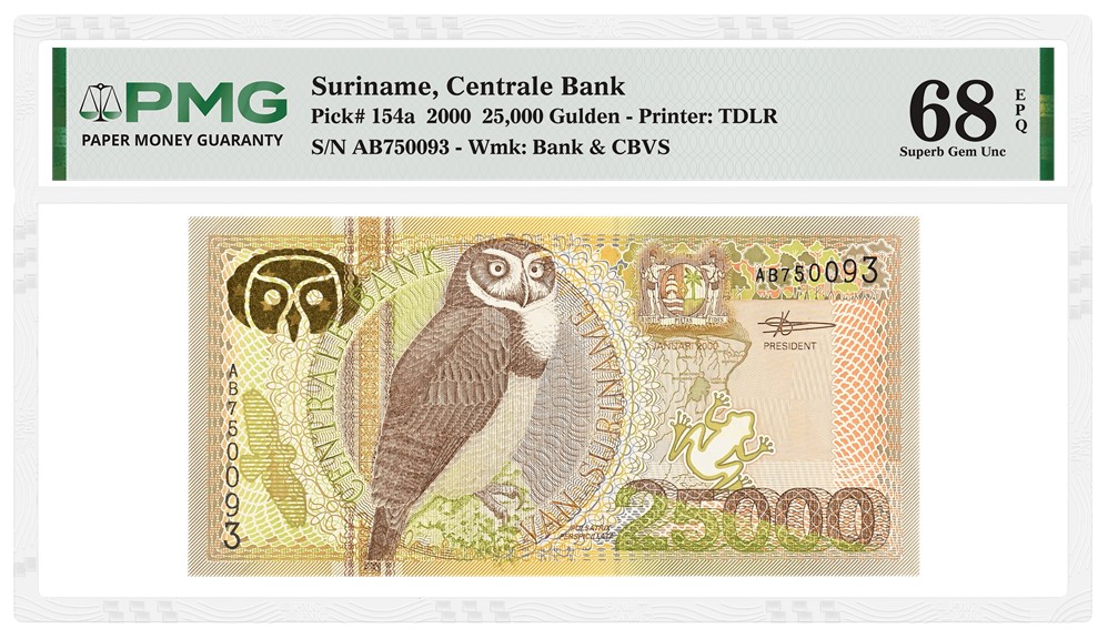 Also available is a Suriname, Centrale Bank 2000 25,000 Gulden graded PMG 68 Superb Gem Uncirculated EPQ (lot 1496). This note originated from a period marked by inflation and the need for higher denominations just before Suriname transitioned to the Surinamese Dollar. The note quickly became obsolete after the currency reform.