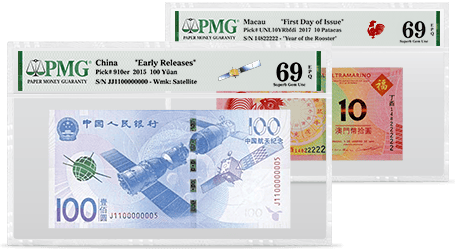 PMG offers the First Day of Issue designation for select notes that are purchased within one day of the first day that a new paper money issue is made available for sale. In some cases, PMG may require a minimum submission quantity for notes to receive the First Day of Issue designation. An article with submission instructions and grading fees will generally be posted to the PMG website prior to an eligible note’s release. In all cases, the First Day of Issue designation is available only by special request and will require a higher grading fee.