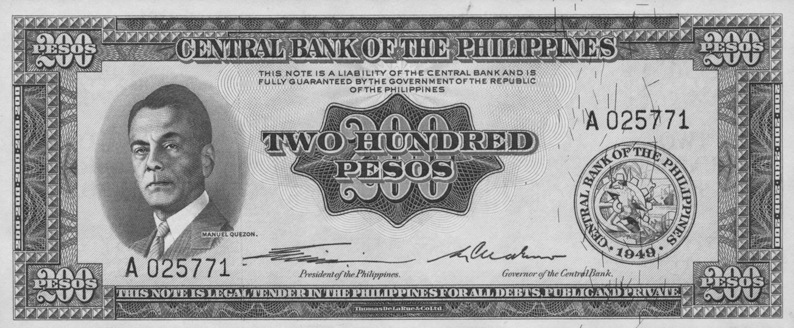 Face Type: Portrait of President Manuel Quezon at left. Large Central Bank Seal Type 1 at lower right. Signature 1.