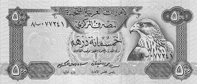 Back Type: Mosque in Dubai at left center. Saker falcon at left.