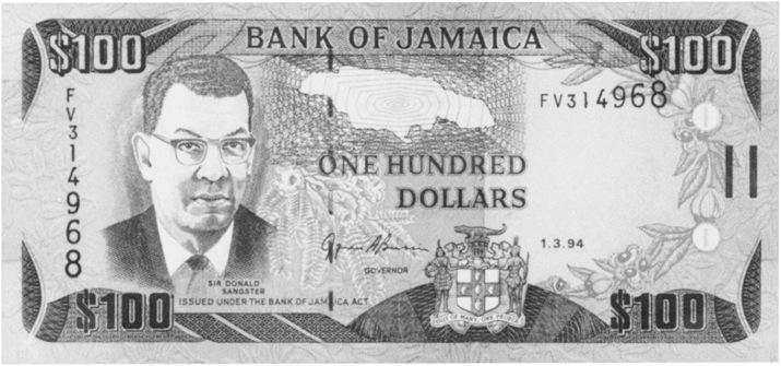 Face Type: Sir Donald Sangster at left. Signature 8. Two circles at right, each with vertical orange bar. Ascending size serial number and segmented foil over security thread.